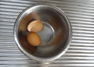1. 冷蔵庫から卵を取り出し、ぬるま湯に5分ひたします。この間に、鍋にお湯をわかしておきましょう。