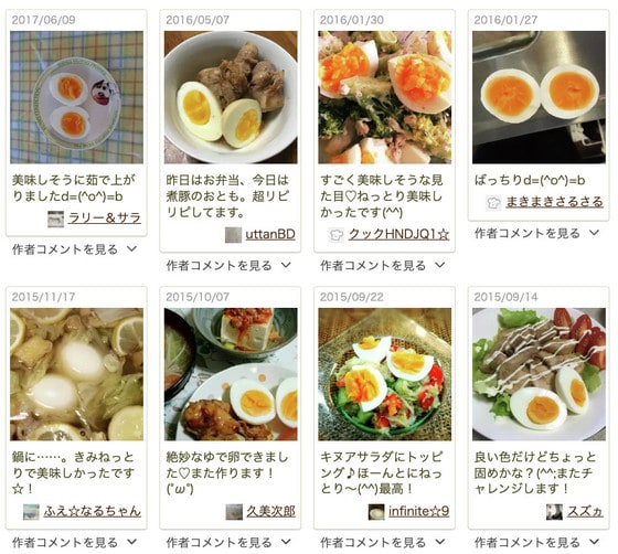 つくれぽ(作りましたフォトレポートのこと)には、「ねっとりしておいしかった!」「いつも助けられています」など、ゆで卵の仕上がりに感動の声が多数寄せられています。