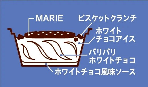 アイス部分の特徴は、ホワイトチョコアイスの中間層にはパリパリホワイトチョコが、下層部にはホワイトチョコ風味のソースが入っていることで、混ぜながら食べることで、ホワイトチョコの味わいを多様な食感とともに楽しめる。