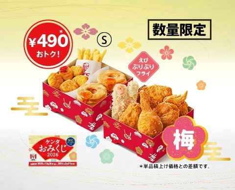 また、お重(松・竹・梅)1セットにつき1枚、抽選で人気商品の無料券があたる「クーポンつきケンタおみくじ」が付いてくる。