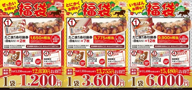 福袋は、1,200円/3,600円/6,000円の3種類を発売。「たこ焼1舟引換券(8個入り)」や、銀だこ特製の「たこめしの素」、毎月使用できる「100円引き(税込価格より)クーポン券 」に加え、福袋限定の “スタンプ” が捺印された 「銀だこスタンプカード」が入っている。数量限定で、毎年売切れ必至の人気商品だという。