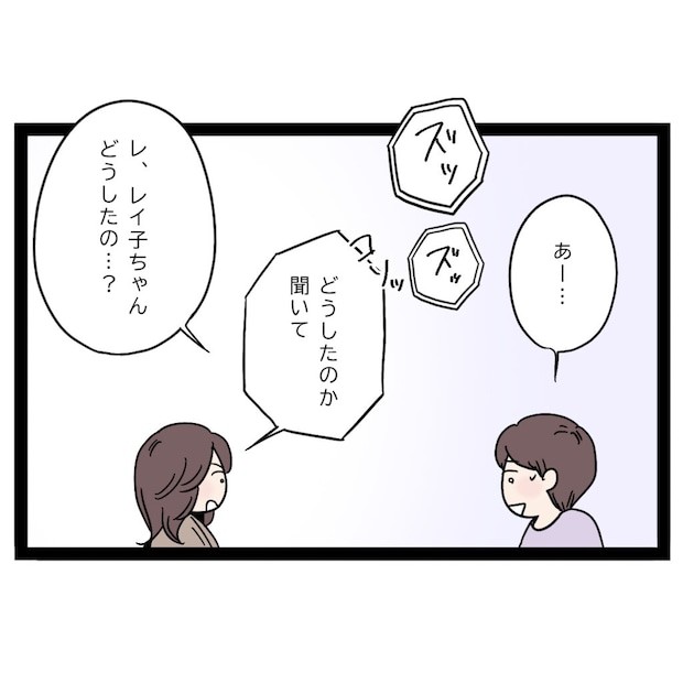 「あー・・」と呟くまさひでに、「どうしたのか聞いて」とこっそり言うと、まだズッズッとすすり声をあげるレイ子に「レ、レイ子ちゃんどうしたの・・?」まさひでが恐る恐るたずねました。