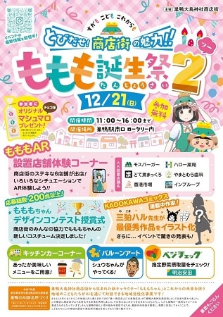 巣鴨大鳥神社商店街は、12月21日(日)の11:00~16:00に、巣鴨駅南口ロータリー内にて、最新AI技術を通じて直接対話ができる「もももちゃん」の新機能を体験できる子ども向け体験型イベント「ももも誕生祭2」を開催する。