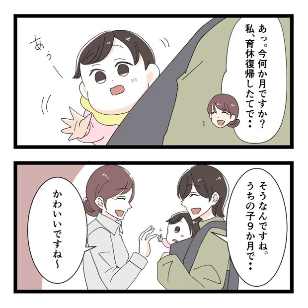 そして、「あっ。今何か月ですか?私、育休復帰したてで・・」と赤ちゃんを見ながらアユミさんがそう言うと、「そうなんですね。うちの子9か月で・・」と答えるマイさん。アユミさんは「かわいいですね~」と赤ちゃんを見つめながらい言いました。