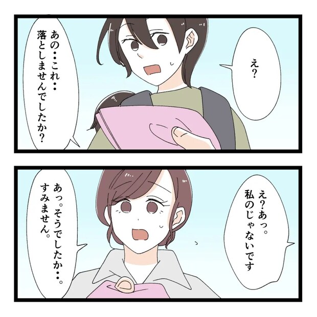 「あのっ!」アユミさんが声をかけると、「え?」と驚いて振り返るマイさん。「あの・・これ・・落としませんでしたか?」アユミさんがそう言うと、「え?あっ。私のじゃないです」と答えるマイさんに、「あっ、そうでしたか・・すみません」アユミさんがあやまりました。