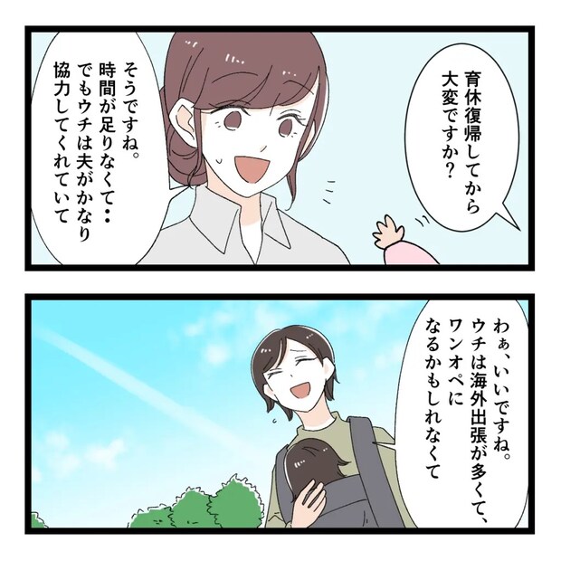 すると、「育休復帰してから大変ですか?」マイさんにそう言われ、「そうですね。時間が足りなくて・・でもウチは夫がかなり協力してくれていて・・」アユミさんがそう言うと、「わぁ、いいですね。ウチは海外出張が多くて、ワンオペになるかもしれなくて」とマイさん。