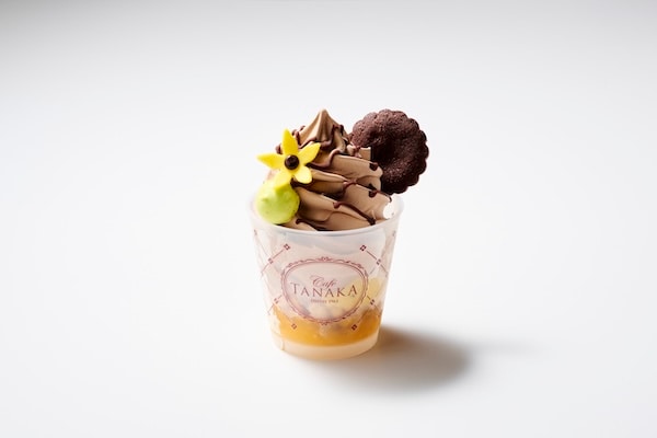 もう一つの新作「ソフティエ・フレ・サントメ・エクアトゥール」1,199円(税込)は、フルーティーな爽やかさを楽しむ三重奏。ウッディでフルーティーかつ繊細な味わいの「ショコラ・サントメ」のソフトクリーム、爽やかな酸味のカカオパルプ(※)と沖縄バナナ&キウイのジェラート、あまずっぱい沖縄タンカン(柑橘)のソースのマリアージュが口に広がる。