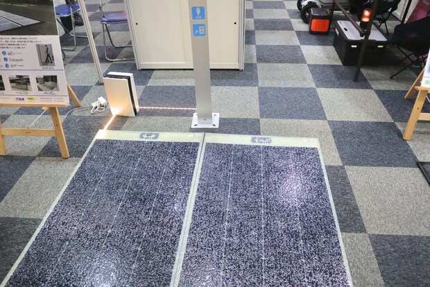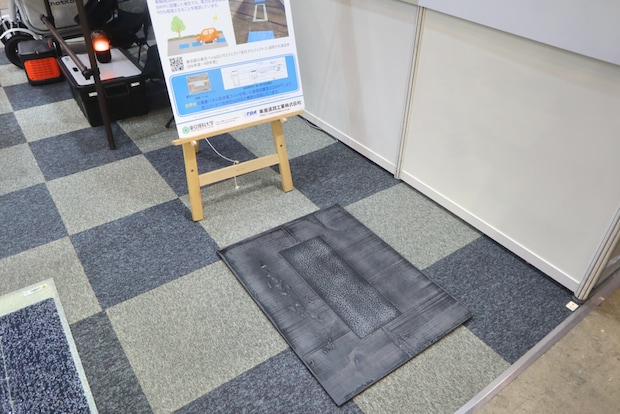 東亜道路⼯業株式会社では、道路舗装路⾯に貼り付けて設置する「舗装式太陽光発電パネル」を展⽰。