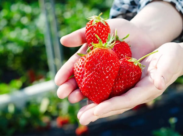 「江間いちご狩りセンター」は、伊豆最大のいちご狩り施設で、大粒いちご「章姫(あきひめ)」とその苺から品種改良された「紅ほっぺ」の2種類があり、どちらが食べられるのかは当日のお楽しみとなる。