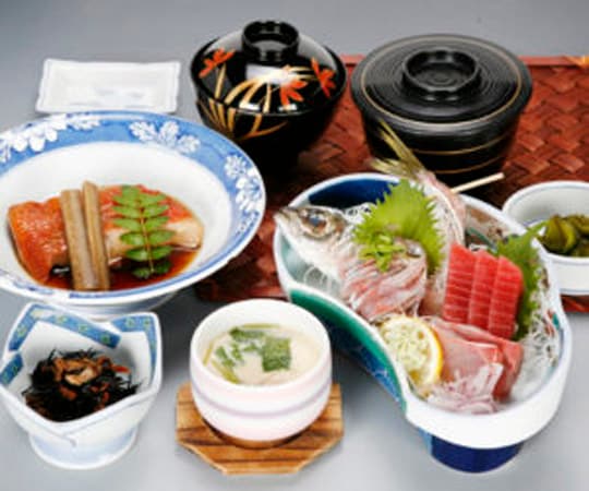 昼食は、下田や伊東の地魚を中心に新鮮な魚介を使った料理を提供する「伊豆高原 和食処 萬望亭」にて、「名物金目鯛の煮付けとお刺身の和食膳」を味わう。