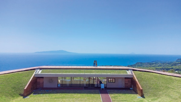 「小室山リッジウォーク“MISORA”」は、標高321mの小室山頂上にあり、展望ブリッジを併設した絶景カフェ「Café・321」は、海・空の雄大な自然景観を360度楽しめるビュースポット。