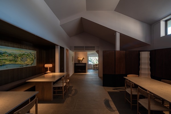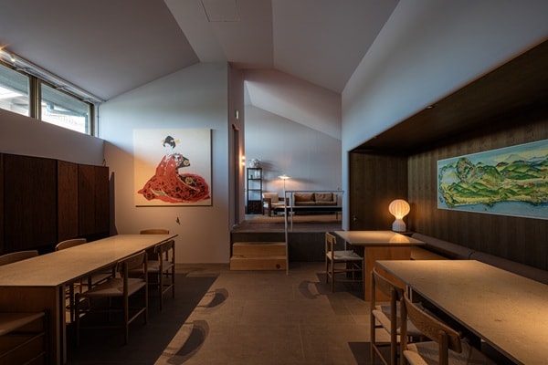 館内は、狗留孫山の自然と心を映した空間デザイン。狗留孫山の静寂と力強さを象徴する天然石を使ったテーブル、狗留孫山に自生する杉を想起させる杉皮を使用した屏風などが配されている。