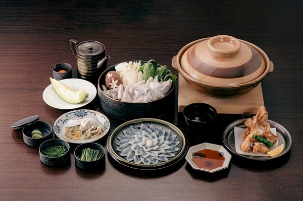 本場下関の“とらふく”をお多福調理人の技で表現する贅沢なフルコースは、3日間熟成したふく刺し、おもてなし係が卓上で作りあげるふくちりをはじめ、ふく皮の前菜、唐揚げ、ふく吸、〆の雑炊まで“とらふく”の旨みを余すことなく味わえる。