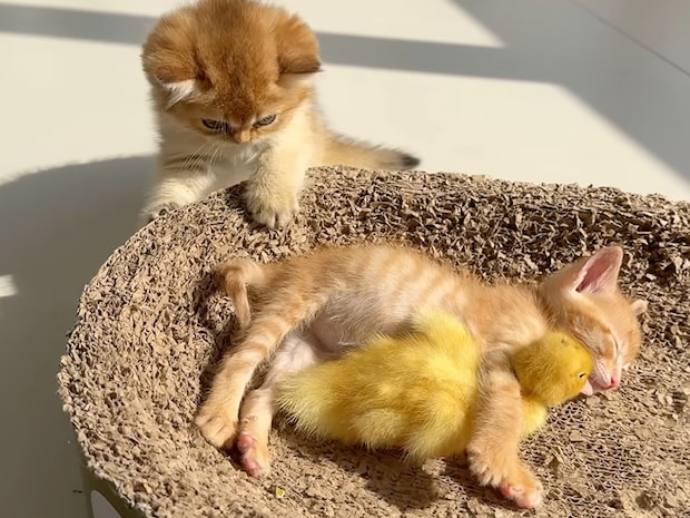 アヒルの子と遊んでいる茶トラ子猫さん、