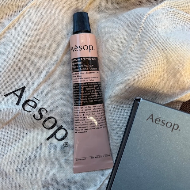 私も長く愛用しているこのピンクのパッケージの〝アンドラム アロマティック ハンドバーム〟マンダリンの皮、ローズマリーの葉、シダーウッドアトラス1を主要成分とするシトラス、ウッディ、ハーバルな香りで私の中でのザ・Aesop!な香り!