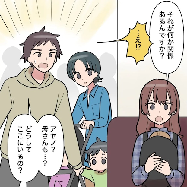 訳の分からない理由を並べて離婚を迫る義母に「それが何か関係あるんですか?」と応戦していると、トモヤがキョウカさん、ソウくん、ルナちゃんと一緒にお店に入って来ました。私と義母の姿を見て「アヤノ?母さんも・・?どうしてここにいるの?」と驚くトモヤ。