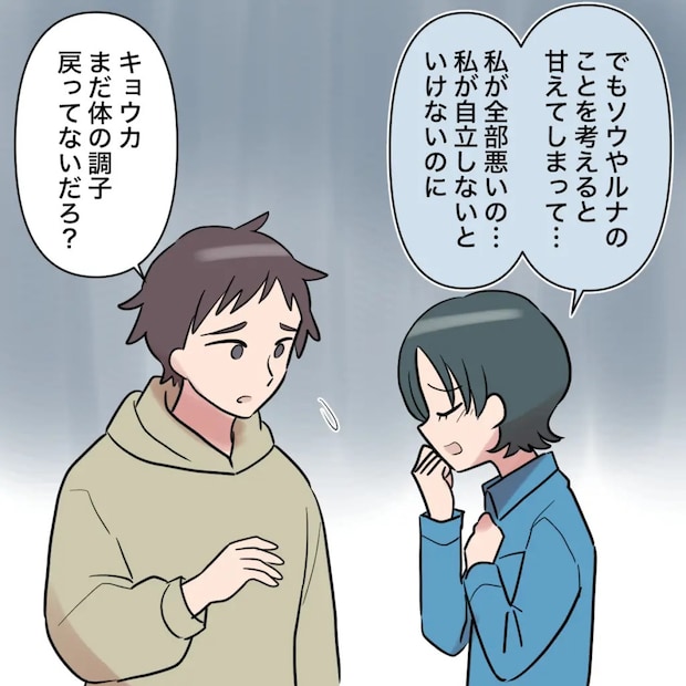 「でも、ソウやルナのことを考えると甘えてしまって・・。私が全部悪いの・・。私が自立しないといけないのに」と涙ぐむキョウカさんを見て、トモヤが「キョウカ、まだ体の調子戻ってないだろ?」と心配そうに気遣います。ねぇトモヤ、私も産後間もないってわかってる?トモヤが義実家から戻ってこないから私はずっとワンオペなんだよ。私の心配はしてくれないの?私はこの人たちに何の茶番を見せられているのでしょうか。