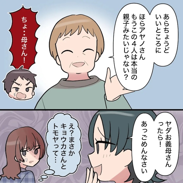 義母は驚くトモヤにお構いなしで「あら、ちょうどいいところに。ほらアヤノさん、もうこの4人は本当の親子みたいじゃない?」とにっこり。トモヤは焦った様子で「ちょ・・母さん!」と止めますが、キョウカさんは「ヤダお義母さんったら!」と笑うと、わざとらしく「あっ、ごめんなさい」とアヤノさんに謝りました。キョウカさんの態度に「え?まさかキョウカさんとトモヤって・・」とイヤな予感。