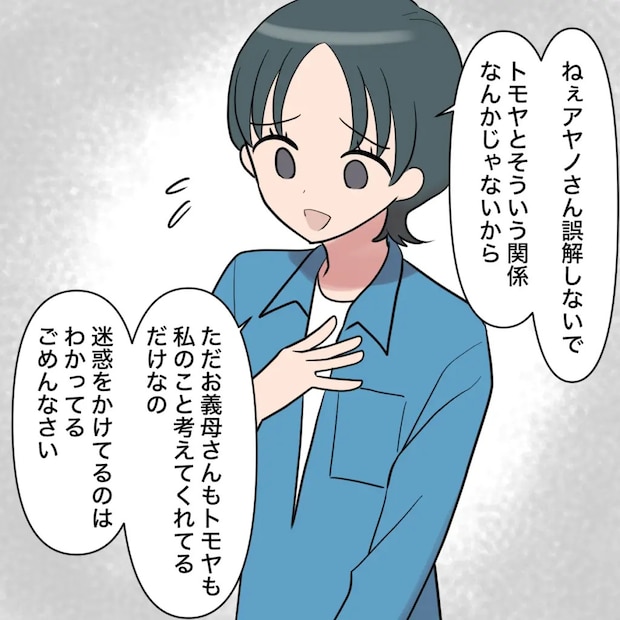 すると、キョウカさんが「ねぇアヤノさん、誤解しないで。トモヤとそういう関係なんかじゃないから。ただ、お義母さんもトモヤも私のこと考えてくれてるだけなの。迷惑をかけてるのはわかってる。ごめんなさい」と申し訳なさそうに謝ってきました。