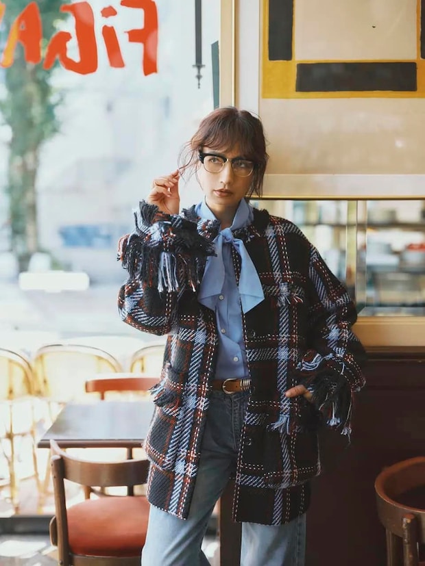 第5位はフリンジとチェック柄がポイントになったツイードジャケットにボウタイブラウス、と存在感たっぷりのコーディネート。デニム合わせでトーンにまとめつつ、ハーフリムの眼鏡をプラスして洒落感もひとさじ。「ジャケットが可愛い」「ブルーの色使いが素敵」「人と被らない感じがいい!」とスタイリングとアイテム選びに絶賛のコメントが集まりました。