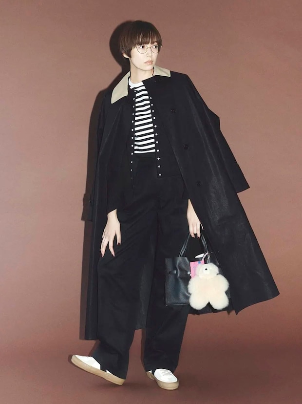 パンツ¥20,900(ザ シンゾーン/シンゾーン 表参道本店)、コート¥159,500(マッキントッシュ/マッキントッシュ 六本木ヒルズ店)、カーディガン¥25,300、ボーダーTシャツ¥14,300(共にアニエスベー)、メガネ¥54,780(オリバーピープルズ/ルックスオティカジャパン カスタマーサービス)、バッグ¥31,900(ヴィオラドーロ)、バッグに付けたポーチ¥2,200(ドリフター/共にル タロン 有楽町マルイ店)、バッグに付けたアニマルチャーム¥5,940(コージー/ル タロン グリーズ ルミネ新宿店)、スニーカー¥35,200(グラフペーパー/グラフペーパー 東京)