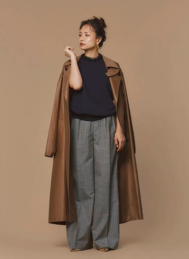 堂々の第1位は、たっぷりとしたシルエットのチェック柄パンツを主役にしたトラッドスタイル。チェックパンツをはじめ、使用しているアイテムは全てトラッドムード満点ながら、レースの付いたニットや光沢感のあるコートなど、さり気ないディテールが旬の着こなしを実現。ネイビー、ブラウンの色合わせもとても上品。