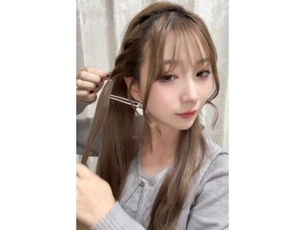 ③で留めなかった方の毛束の上部をすくい取り、2つに分けます。