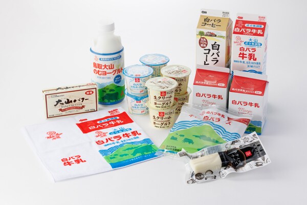 「《ハンドタオル付き》牧場のわくわくセット」(冷蔵)は、「白バラ牛乳1000ml」「白バラコーヒー1000ml」「鳥取大山のむヨーグルト750ml」各1本、「大山高原生クリームヨーグルト300g(75g×4)」「白バラ生乳ヨーグルト280g(70g×4)」「スティックチーズさけるタイプ40g」各1個、「白バラキャンディチーズ80g」1袋、「白バラ牛乳まんじゅう(3個入)」2個、「大山バター150g」1個の乳製品と、「白バラ牛乳ハンドタオル」1枚がセットになっている。