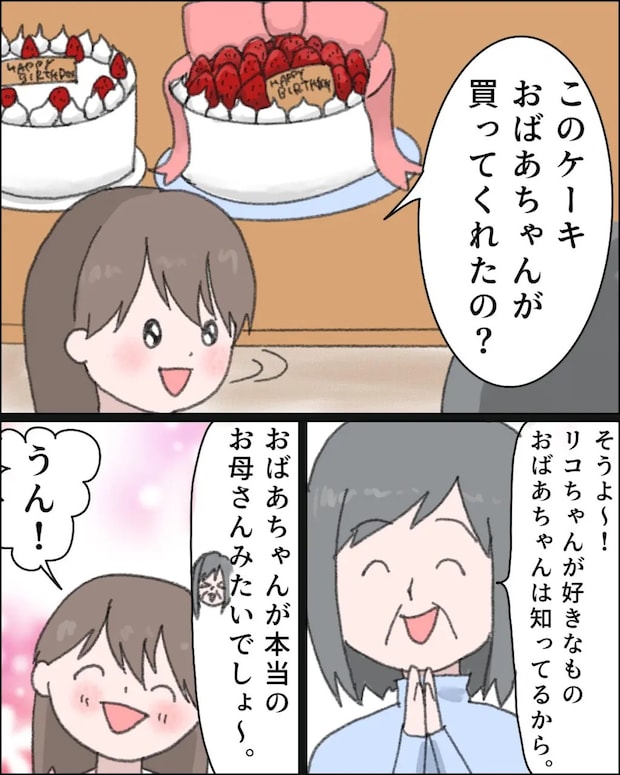 「このケーキ、おばあちゃんが買ってくれたの?」目を輝かせて尋ねるリコに、義母は「そうよ~おばあちゃんはリコちゃんが好きなものを知ってるから」と得意げに言いました。「おばあちゃんが本当のお母さんみたいでしょ~」と義母がそう言うと、リコは満面の笑みで「うん!」と頷きます。
