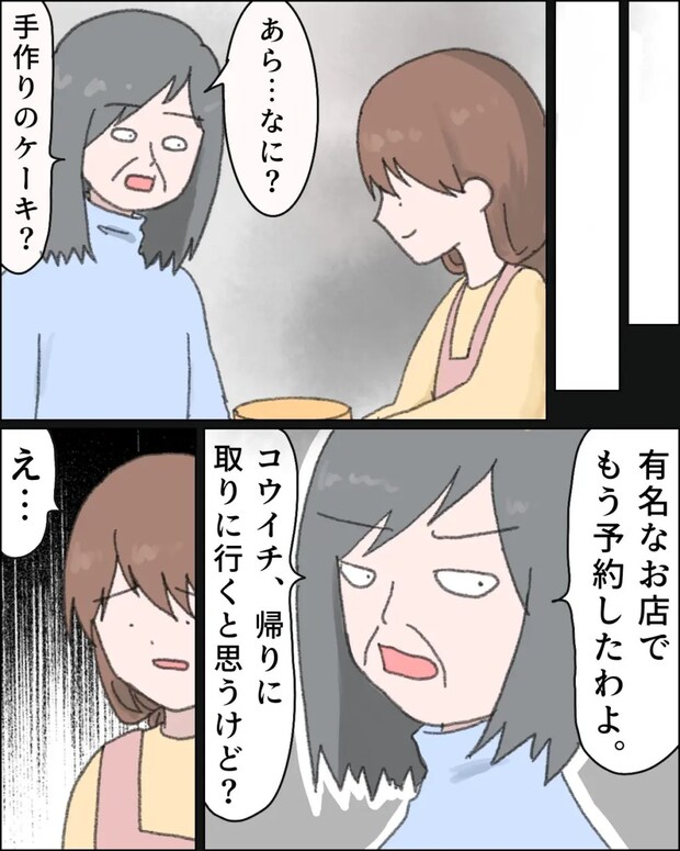 ケーキの土台を焼き終えて後は仕上げるだけ。そのとき、義母が「あら・・・なに?ケーキ」と声をかけてきて、「ケーキなら有名なお店でもう予約したわよ、コウイチが帰りに取りに行くと思うけど?」と冷たく言いました。ケーキ、別で用意してたんだ・・・。何も聞かされていなかった私は戸惑いを隠せませんでした。