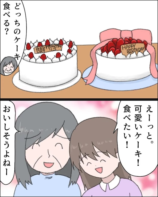 義母は私の手作りケーキとお店のケーキを並べて、リコに「どっちのケーキを食べる?」と尋ねます。リコは少し考えたあと、「えーっと・・・可愛いケーキ食べたい!」そう言って、ピンクのリボンで華やかに飾られたケーキを指さしました。義母は自分が用意したケーキが選ばれて、満足そうな表情を浮かべます。