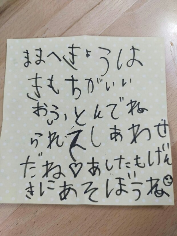 お手伝いでベッドメイキングをしてくれるだけでも立派ですが、置き手紙までしてくれたという息子さん。「きもちがいいおふとんでねられて しあわせだね」という言葉からは、日々温かい幸せをたくさん感じながらすくすく成長していることがうかがえます。