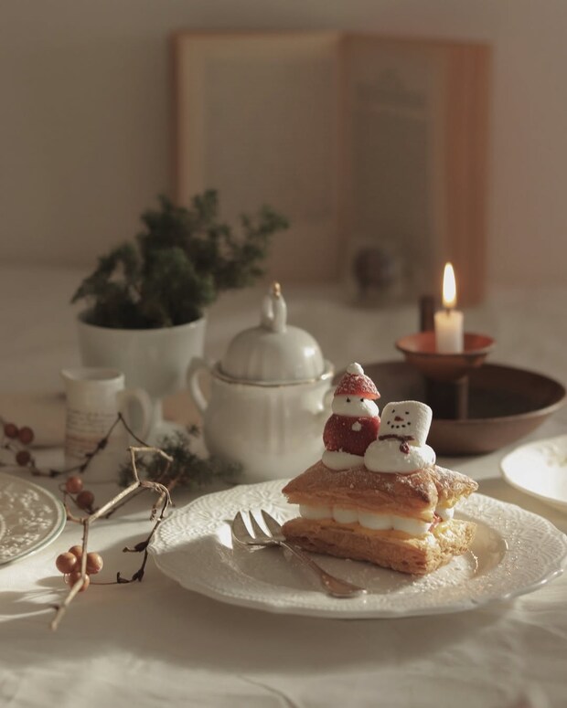 @mmny_09さんが作っているのは、クリスマスのデコレーションで着飾ったミルフィーユ。生地は冷凍のパイシートを使っているので手軽に作れるのが良いですね。クリームと苺で作られたサンタクロースと、マシュマロとホイップクリームで作られた雪だるまがかわいい! 季節に応じてのせるモチーフを変えて楽しめますよ。