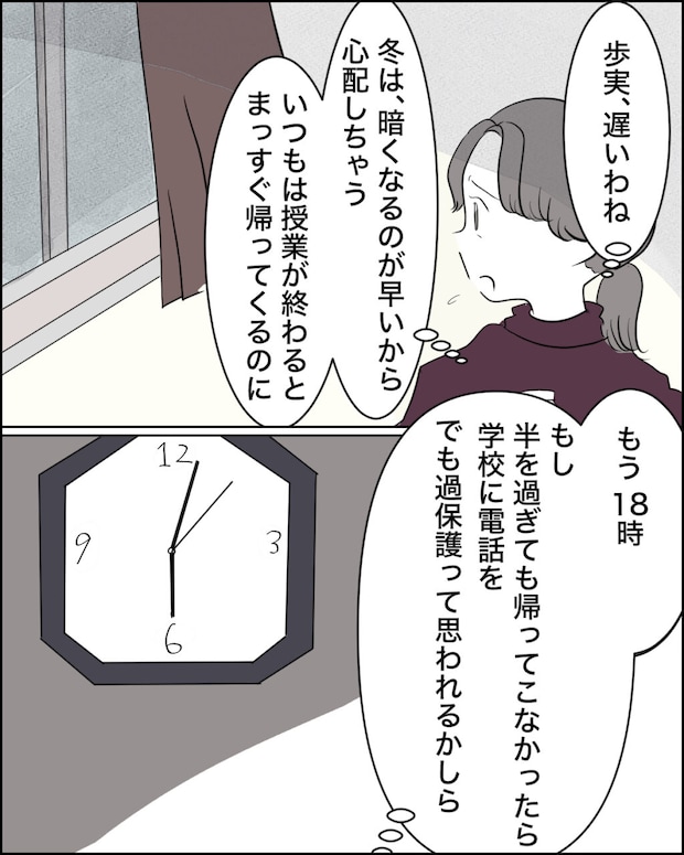 そんなある日。いつもならとっくに帰ってきているはずの時間になっても歩実が帰って来ません。もう18時で外は真っ暗です。何かあったのでは心配になった私は、18時半を過ぎても帰って来なかったら学校に電話をしようと考えましたが、過保護だと思われるかもしれないという考えがよぎり電話は思いとどまりました。