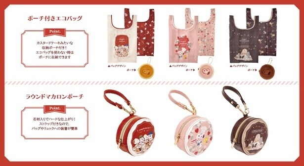 「ポーチ付きエコバッグ」(各2750円)は、たたんでカスタードケーキそっくりのポーチにしまっておけるすぐれもの。リップやアクセのほか、ワイヤレスイヤホンやケーブルなどの小物の収納に便利な「ラウンドマカロンポーチ」(各3080円)はバッグの持ち手などに吊るして。