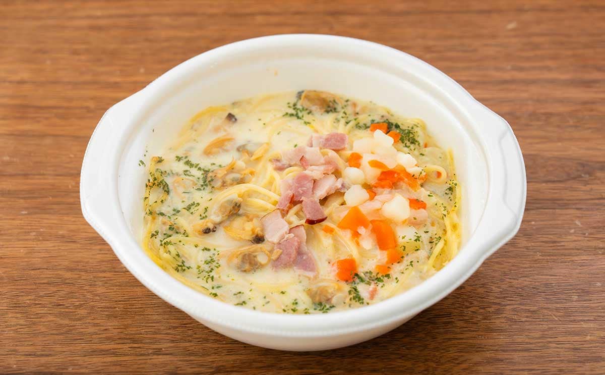 本商品は、あさりや野菜の旨みが溶け込んだクラムチャウダースープにパスタを合わせたものです。