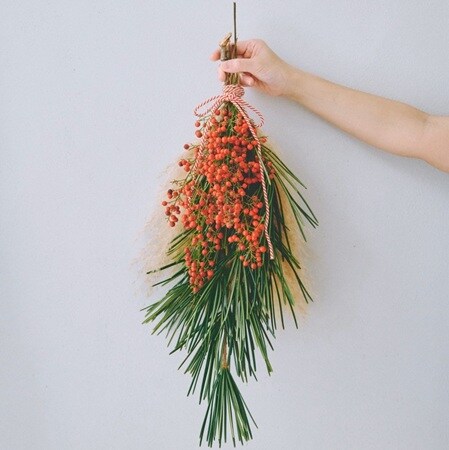 (2)1カクテル付きトーク+スワッグづくり体験は、花屋である西村美奈代さんに教わりながら、高野槙・南天・柊など和歌山産の素材を用いたスワッグをつくる。