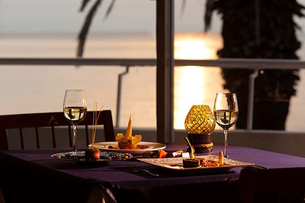 ディナー7,150円(税込)は、アミューズ「生ハムのフィナンシェ&季節のポタージュ」、前菜「地魚のカルパッチョと三浦の畑サラダ」、魚料理「魚介のブイヤベース仕立て」、肉料理「三元豚のグリルロメスコソース&バルサミコクリーム カポナータと地野菜のグリル」または「和牛ヒレ肉のグリル トリュフ香るソース 地野菜のグリルとマッシュポテト」(+2,200円)、「本日のデザート」で締めくくる。