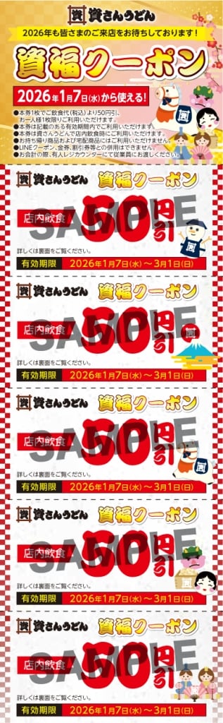 ※クーポンは、2026年1月7日(水)~3月1日(日)の期間中、店内飲食の会計時に「有人レジ」にて提示(資さんうどん全店舗)。「セルフレジ」は非対応となるので注意