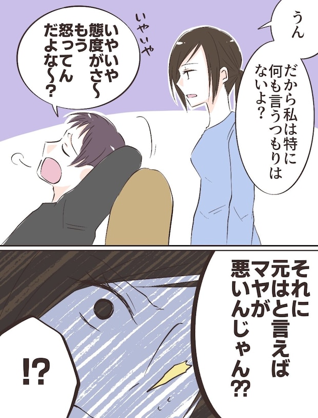 私は文句を言いたい気持ちをぐっと堪えて、「うん、だから私は特に何も言うつもりはないよ?」と伝えます。しかし、私がいつまでも落ち込んでいるのが気に入らないのか、タイキは「いやいや、態度がさ~もう怒ってんだよな~?」とため息。しまいには「それに元はと言えばマヤが悪いんじゃん?」と言ってきました。