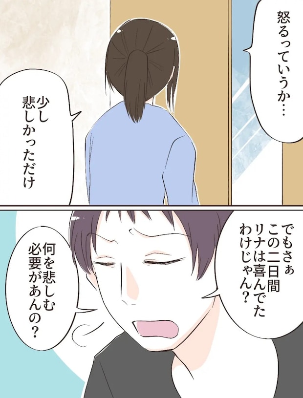 私は「怒るっていうか・・・少し悲しかっただけ」と、この2日間で感じた気持ちを伝えました。するとタイキは、「でもさぁ、この2日間リナは喜んでたわけじゃん?何を悲しむ必要があんの?」とため息をつきます。確かにタイキの言う通りですが、それでも私の気持ちに少しだけ寄り添ってほしいと思ってしまいました。
