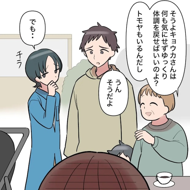 すると、「そうよ。キョウカさんは何も気にせずゆっくり体調を戻せばいいのよ?トモヤもいるんだし」と義母もキョウカさんを気遣い、「うん、そうだよ」とトモヤも義母に同意。キョウカさんは「でも・・」と私の方を見ると、