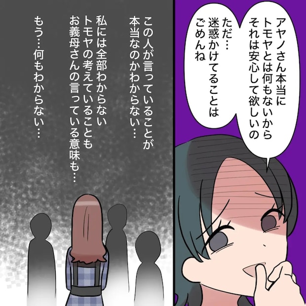 「アヤノさん、本当にトモヤとは何もないからそれは安心してほしいの。ただ・・迷惑かけてることはごめんね」と申し訳なさそうに言いました。自分が悪い、私に迷惑をかけていると自覚しながらも、トモヤを頼ることをやめるつもりはないキョウカさん。この人が言っていることが本当なのかわからない、トモヤの考えていることも、お義母さんの言っている意味も・・もう何もわからない・・。