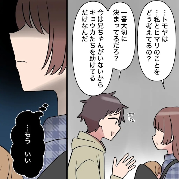 私は「・・トモヤは・・私とヒマリのことをどう考えてるの?」と聞きました。トモヤは「一番大切に決まってるだろ?今は兄ちゃんがいないからキョウカたちを助けてるだけなんだ」と言いましたが、これまでもそう言って私とヒマリよりもキョウカさんたちを優先し続けてきました。・・もうトモヤに期待しても無駄。