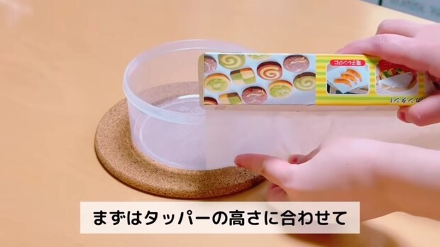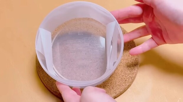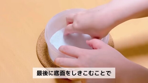 はさみで切った底面をタッパーに敷きます。