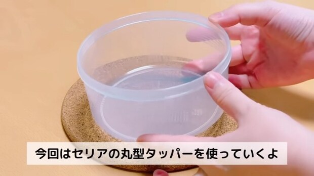 今回はセリアの丸形タッパーを使っています(直径13㎝・高さ6㎝・600ml/電子レンジ対応)。これで2~4人分の量が作れます。