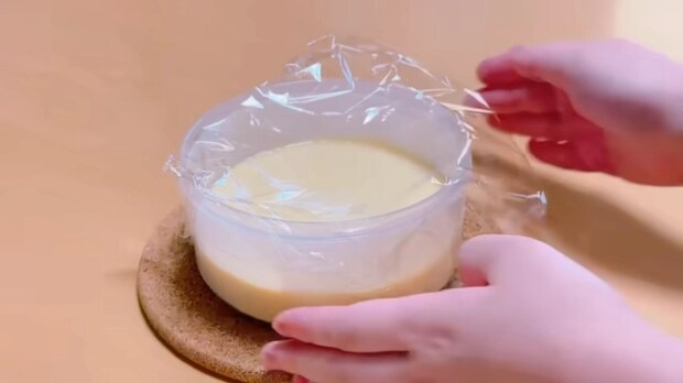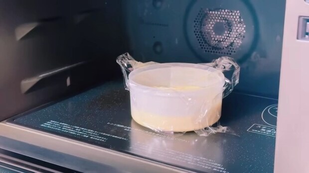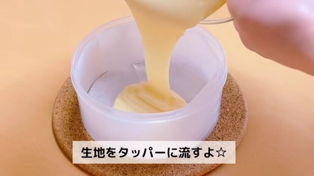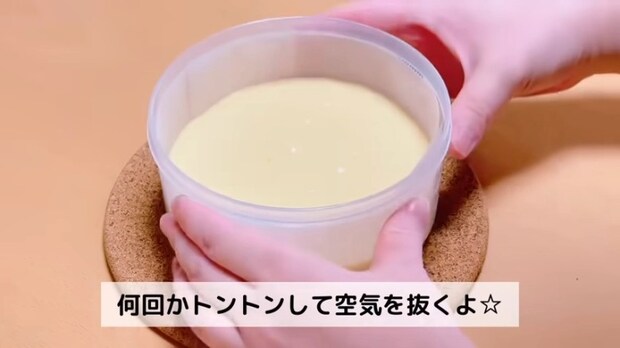 - ③の生地をタッパーに流し入れ、何回かトントン落としてふんわりラップをかける