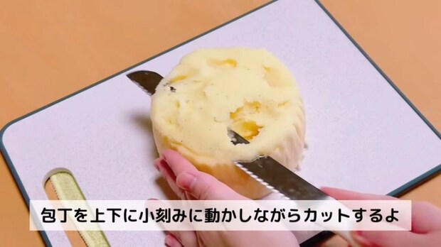 表面がデコボコしているのでなめらかになるよう少しだけカットします。包丁を上下に小刻みに動かしましょう。(カットした生地は味見用にどうぞ♪)