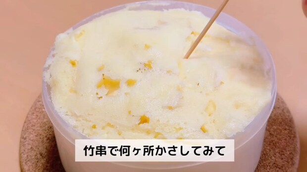 火傷に気を付けてラップを外します。竹串で何か所か刺してみて生地がついてこなければOK!
