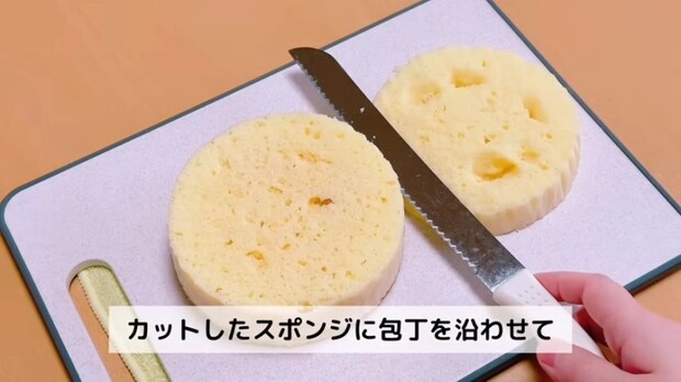 スポンジを3枚にスライスしていきます。1枚目をカットしたら隣に並べて、同じ高さになるようカットしたスポンジに包丁を沿わせて切っていきます。